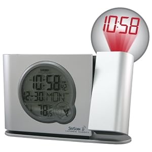 From Equity by La Crosse’s SkyScan line of atomic clocks, this alarm clock shines the precise time in red digits on a wall or flat surface with its side-ported projector. The clock’s internal antenna picks up the NIST WWVB radio signal from the U.S. atomic clock in Fort Collins, Colorado, and sets itself accordingly for increased accuracy. Updating daily, the clock adjusts for Daylight Savings Time. The clock also monitors indoor temperatures to a tenth of a degree.The alarm clock’s round LCD screen conveys the time by the hour, minute, and second; a PM indicator signifies afternoon and evening hours. When the snooze alarm is engaged, the clock displays an alarm notification icon. For nighttime screen viewing, the clock’s dial lights up on demand. The clock relates the current month and day using its perpetual calendar, as well as the day of the week. To power the clock, two alkaline AA batteries are required. A limited 90-day warranty covers this item. The alarm clock measures approximately 9-1/2 inches wide by 2-4/5 inches deep by 7-1/2 inches high and weighs 1-1/2 pounds upon shipping.