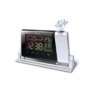 A multi-function graphical gadget, this projection clock from Oregon Scientific combines unfailingly accurate time with a color-coded weather prediction system and handy temperature gauge. Working with an included wireless remote sensor, the unit displays color-coded weather predictions and projects both time and outdoor temperature onto the ceiling or wall for easy checking in the dark. Options include 12- or 24-hour forecasting, 180-degree projection rotation, and memory function for daily high and low temps. The clock also includes a crescendo alarm and an 8-minute snooze feature. Using a radio signal, it checks itself regularly against the U.S. Atomic Clock and resets automatically for Daylight Savings Time. Batteries for the base unit and the sensor are included; the base can also be run with the included AC adapter.